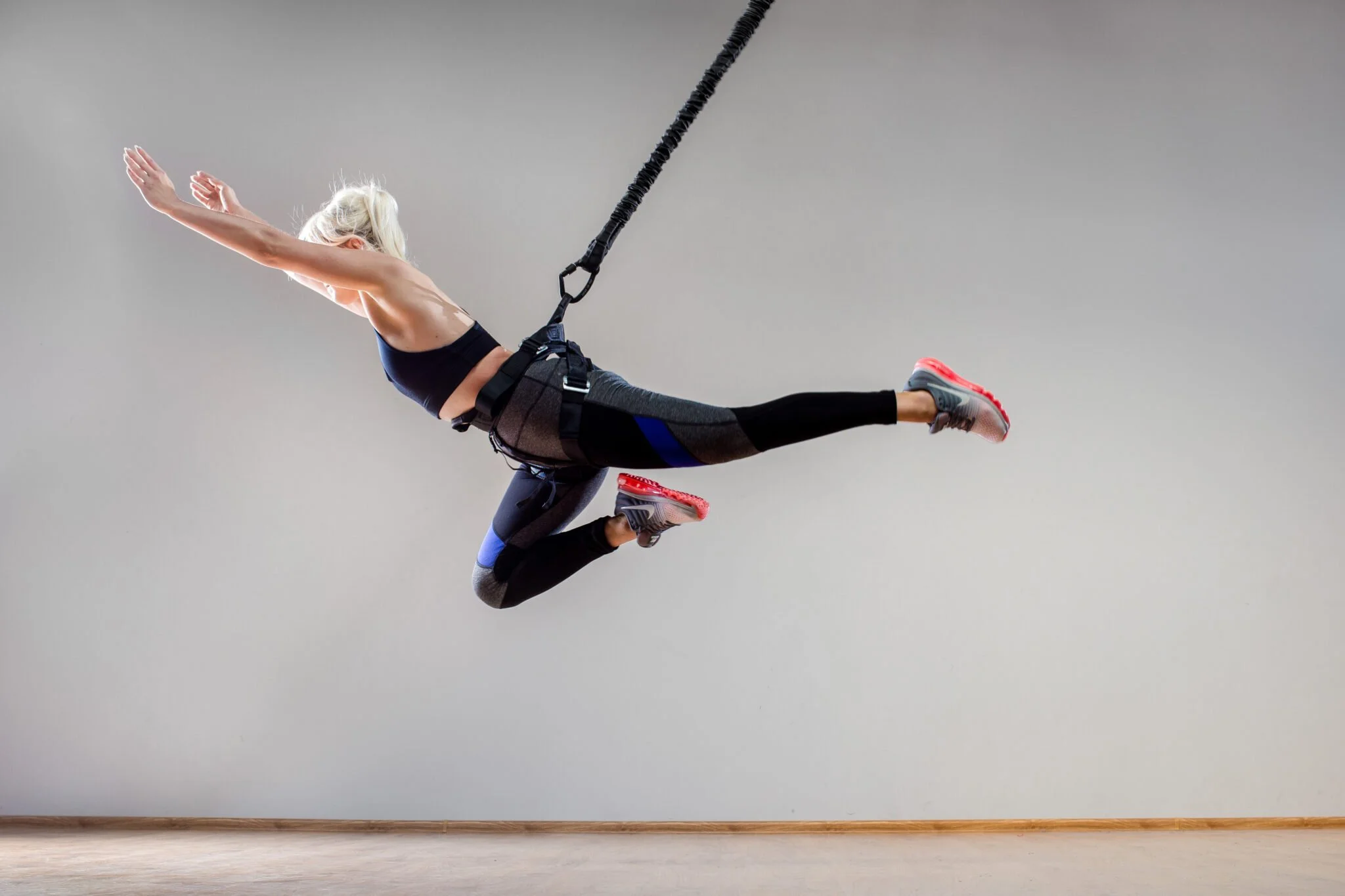 In a Bungee Fitness class, participants wear a padded harness attached to ceiling-mounted bungee cords. These bungee stations are safety rated from 90-225 lbs. This setup enables a high-intensity, low-impact workout, reducing joint stress by 50-70%.