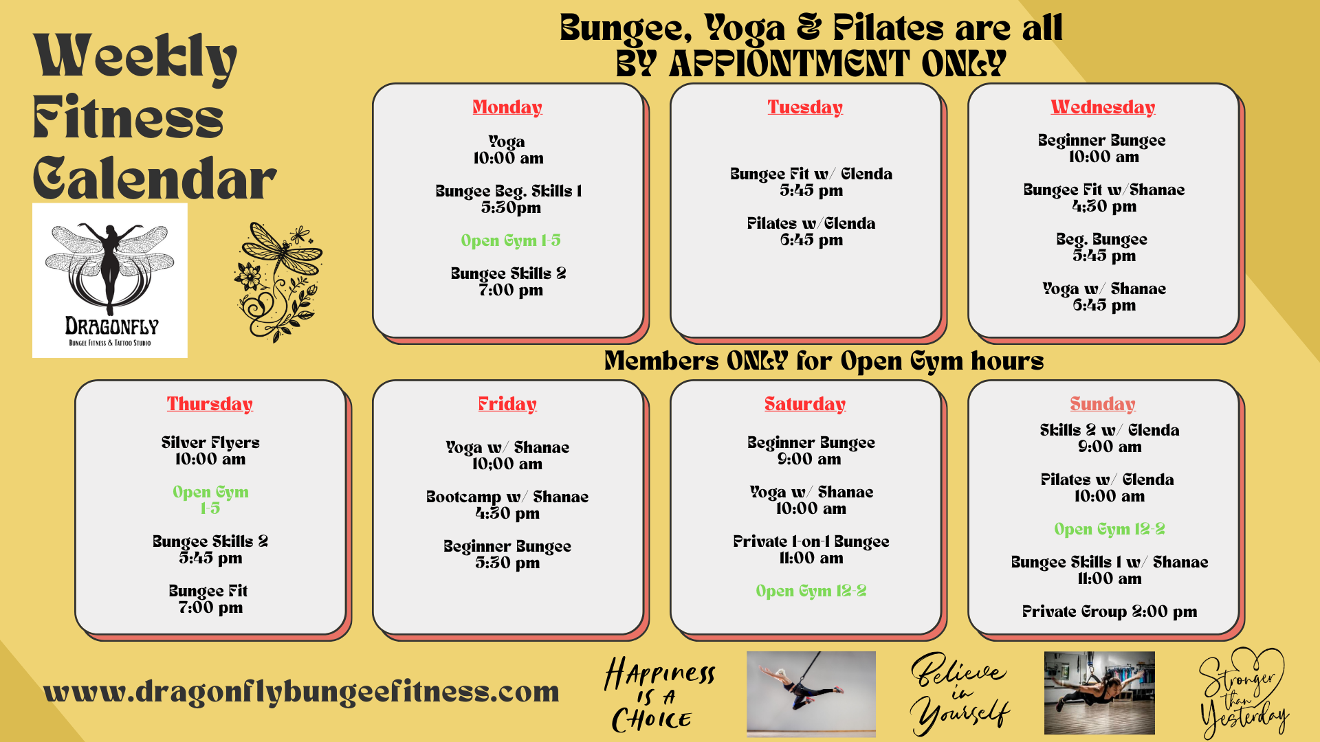 **PRIVATE BOOKINGS FOR YOGA, PILATES & BUNGEE ARE AVAILABLE BY REQUEST**
